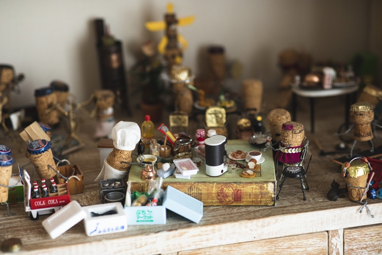仕事場の棚の一角にある手製コルク人形の街